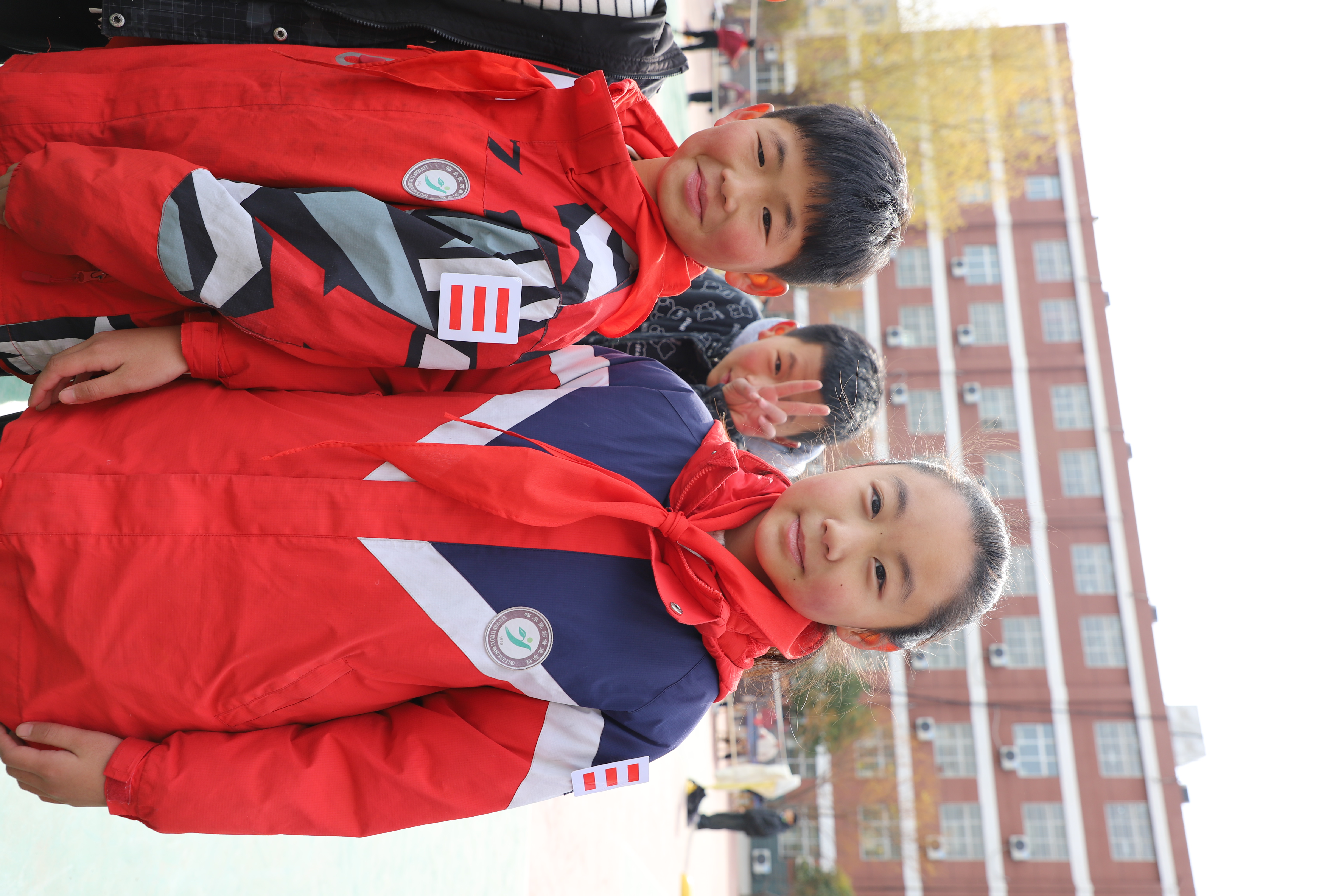 在官方捐贈儀式結束后,我前去操場(chǎng)和學(xué)生們互動(dòng)。一位扎著(zhù)俏皮馬尾、眼眸亮若星辰的“三道杠”小孩姐,仿若春日云雀,歡快輕盈地蹦跳到我跟前,小手拽著(zhù)我的衣角,奶聲奶氣卻又擲地有聲:“叔叔,我們是光榮的少先隊員,可以給我們拍張照嘛?”