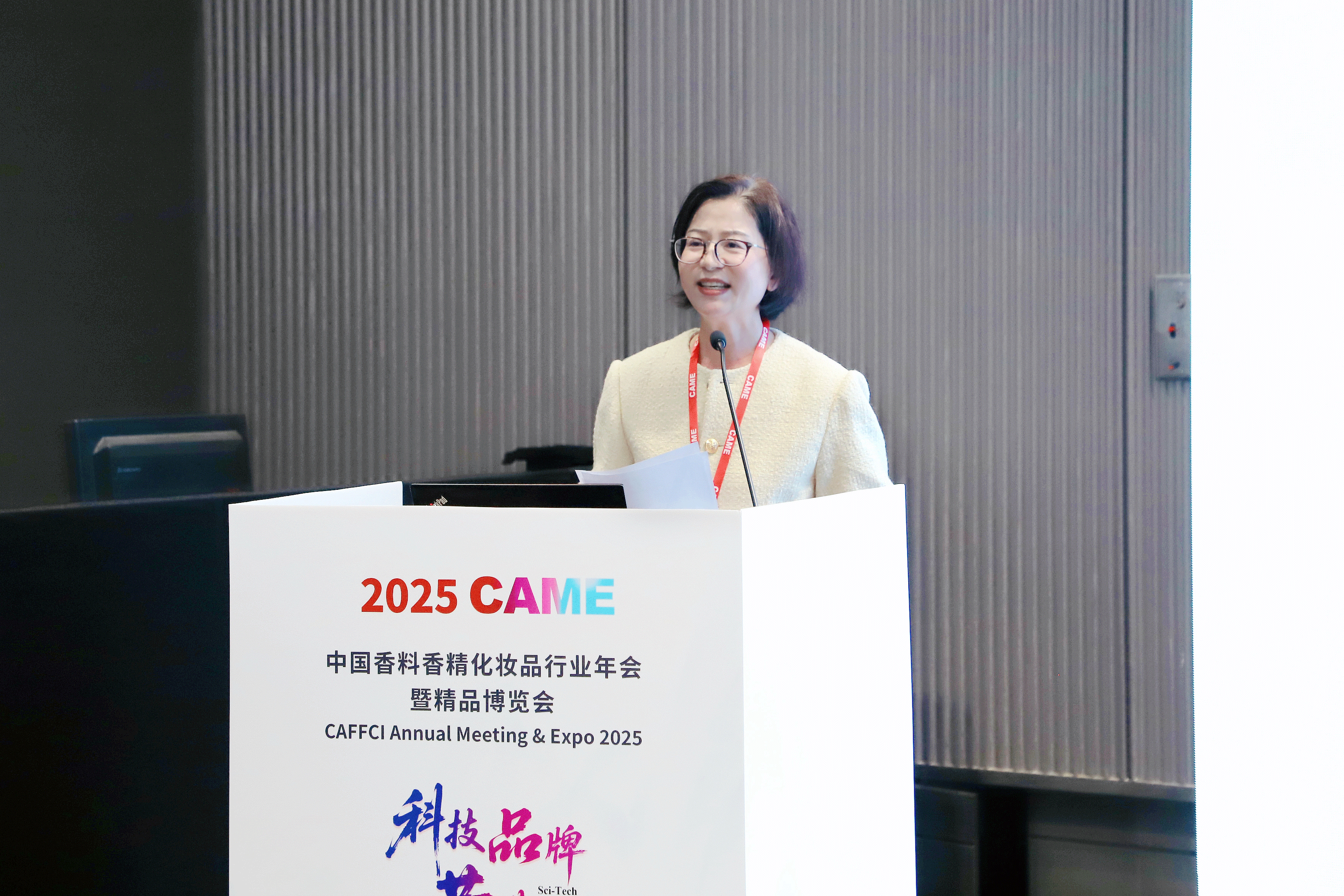 儀式上,華寶股份董事、總裁袁肖琴發(fā)表了熱情洋溢的致辭。她指出,當前中國香妝行業(yè)正處在高質(zhì)量發(fā)展的關(guān)鍵階段,華寶股份積極響應香妝協(xié)會(huì )“創(chuàng )新、品質(zhì)、管理、誠信、協(xié)同”為核心的品牌建設綱領(lǐng),并深受顏江瑛理事長(cháng)提出的“科技力、產(chǎn)品力、文化力、傳播力”四力合一的品牌理念啟發(fā)。