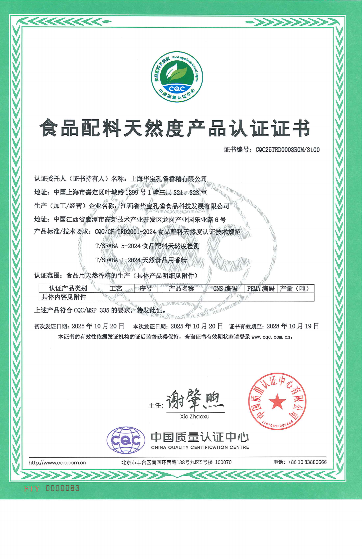 華寶股份下屬企業(yè)華寶孔雀積極開(kāi)展食品用天然香精認證,