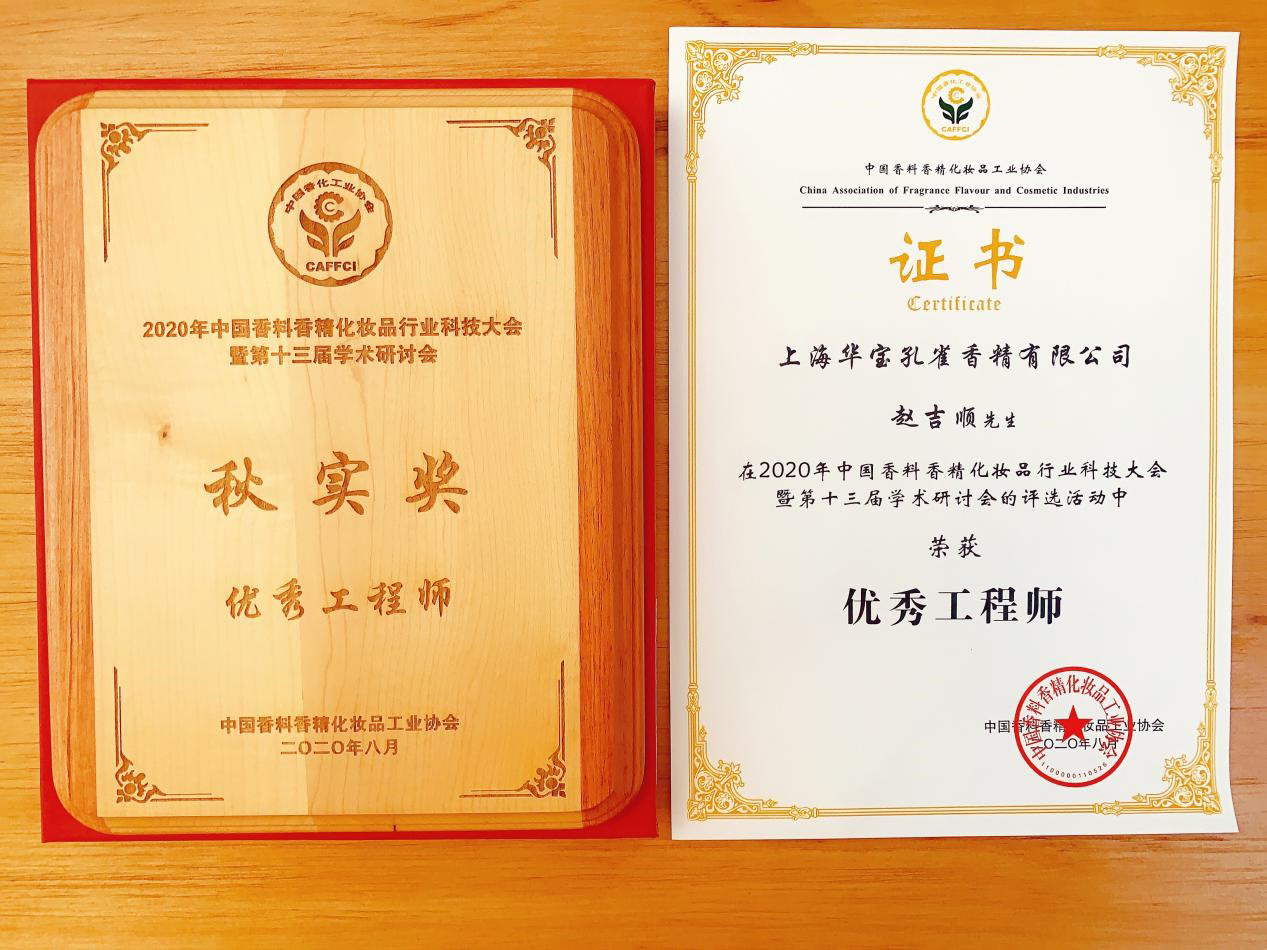 在大會(huì )頒獎典禮上,華寶孔雀憑借突出的科研貢獻、卓越的專(zhuān)利創(chuàng )新榮膺中國香料香精化妝品工業(yè)協(xié)會(huì )頒發(fā)的“優(yōu)秀研發(fā)團隊”、“科技領(lǐng)導獎”、“優(yōu)秀工程師”三項榮譽(yù)稱(chēng)號。華寶孔雀高級技術(shù)總監、總調香師向群女士榮獲“科技領(lǐng)導獎”;高級工程師趙吉順先生榮獲“優(yōu)秀工程師獎”。