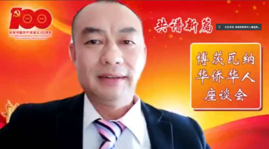 值此中國共產(chǎn)黨百年華誕來(lái)臨之際,2021年6月15日,非洲F&G公司總經(jīng)理朱華文先生出席了由博茨瓦納中國和平統一促進(jìn)會(huì )聯(lián)合旅博僑界舉辦的以“僑心向黨,共譜新篇”為主題的博茨瓦納華僑華人云端座談會(huì ),并代表非洲F&G所在地佛朗西斯敦華人商會(huì )在會(huì )上發(fā)言。