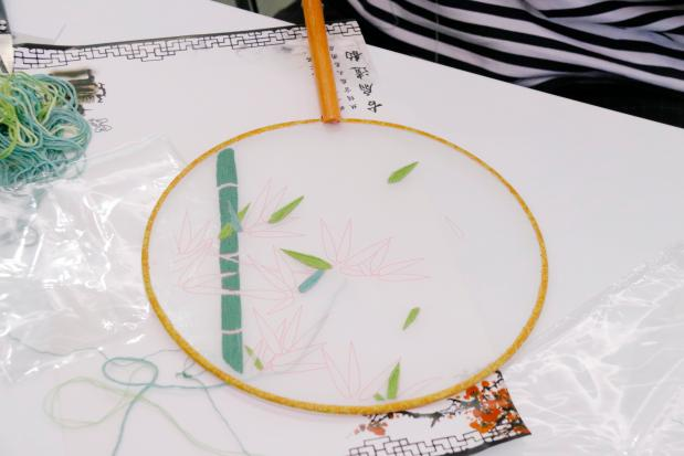 活動(dòng)現場(chǎng),老師為大家準備了團扇和刺繡工具,并為大家展示了精美的刺繡圖案。老師介紹了刺繡古風(fēng)團扇制作的基本步驟和技巧,包括選材、設計、刺繡等環(huán)節,重點(diǎn)講解了緞面繡、輪廓繡、法式結粒繡、直線(xiàn)繡、回針繡多種刺繡繡法。
